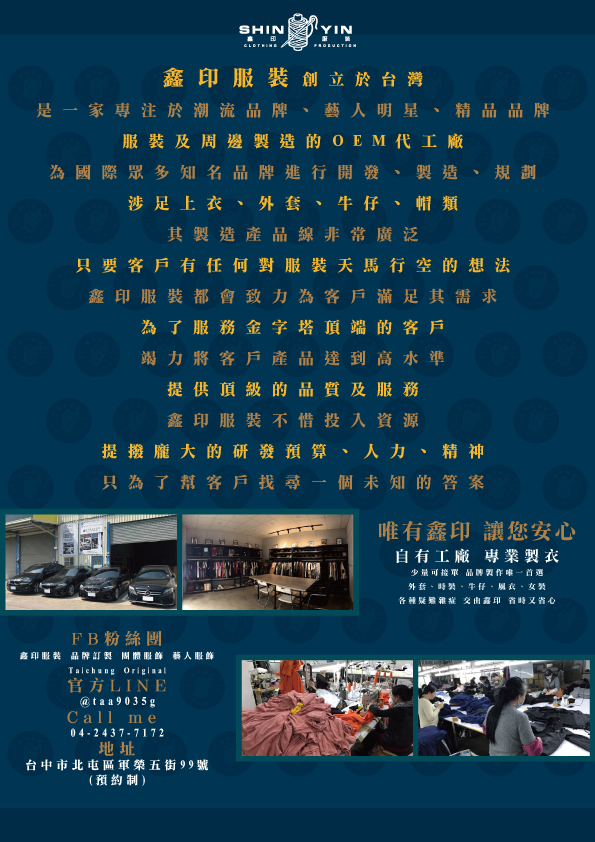 服飾設計 團體服 公司制服 戲服 系服 公司 校服 公司服 鑫印服裝 班服 炫彩 印刷 台中團服製作 台中班服製作 新北團服製作 新北班服製作 台北團服製作 台北班服製作 桃園團服製作 桃園班服製作 苗栗團服製作 苗栗班服製作 台南團服製作 台南班服製作 高雄團服製作 高雄班服製作 新竹團服製作 新竹班服製作 彰化團服製作 彰化班服製作 屏東團服製作 屏東班服製作 雲林團服製作 雲林班服製作 嘉義團服製作 嘉義班服製作 宜蘭團服製作 宜蘭班服製作 花蓮團服製作 花蓮班服製作 澎湖團服製作 澎湖班服製作 金門團服製作 金門班服製作 南投團服製作 南投班服製作 台中品牌製作 台北品牌製作 新北品牌製作 桃園品牌製作 苗栗品牌製作 台南品牌製作 高雄品牌製作 新竹品牌製作 彰化品牌製作 雲林品牌製作 彰化品牌製作 屏東品牌製作 #鑫印服裝 #自創品牌 #客製化 #精梳棉 #MIT #代工 #工廠 #刺繡 #印刷 #水洗 #寬版 #衣版 #打版 #時裝 #帽子 #外套 #藝人周邊 #包包 #公司制服 #工裝 #牛仔褲 #洋裝 #瑜珈服 #成衣廠 #POLO衫 #TEE #班服 #西裝外套 #團體服